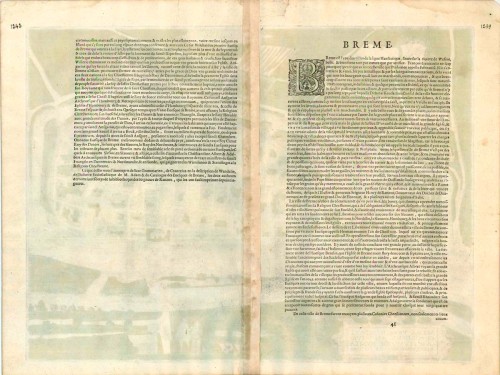 COMMENTARY BY BRAUN (on verso): "The citizens of the city are either merchants or artisans, and there is an inordinate number of skilled shipwrights. By nature they are quarrelsome, clever and tend towards rebellion, as testified by past and recent history. For this reason the burgomaster of Bremen, Ditmar Kenkel, although a learned man, was obliged to leave the city with other councillors, as he has declared in a book published in Ursel in 1565. [...] There is a large wide market square where all sorts of vital necessities are sold every week. In the middle of the square stands a statue of the Emperor and King, holding only the sword of justice in his hand. One side of the market is dominated by the cathedral, the other by the town hall."