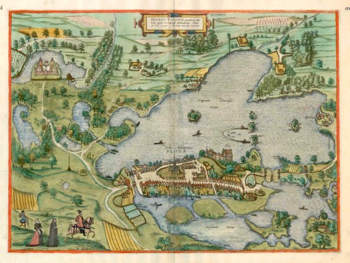 COMMENTARY BY BRAUN: "The Greater Lake, which borders the town and the castle to the south, is two miles long and one mile wide; it is full of fish and the eels exceed the other fish in size and volume; they are caught in five eel crates, one of which belongs to Heinrich Rantzau, the Governor of Denmark, who first tore it down and then rebuilt it from the ground up in a magnificent manner."