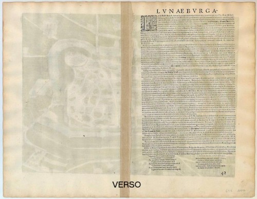 COMMENTARY BY BRAUN (on verso): "The city of Lüneburg is very famous in Lower Saxony and takes its name either from the statue of Luna that in ancient time stood on the limestone hill or from the little river that flows past it, now called the Ilmenau but formerly known as the Luno, or Lunaw. [...] In this city, there is a remarkable saline spring, a wonderful gift from God the Almighty [...]. It is first mentioned in the chronicles of Emperor Otto I. As the chronicler Helmond of Bosau has written, Henry the Lion promoted salt production in Lüneburg over the saline springs in Oldesloe, which he ordered to be filled in so that the city of Lüneburg would not be disadvantaged."
