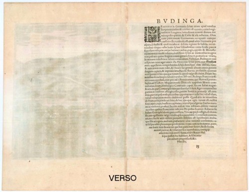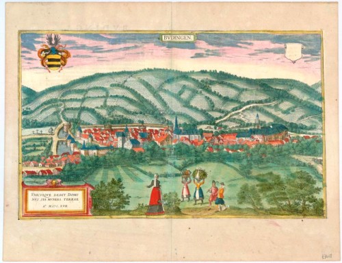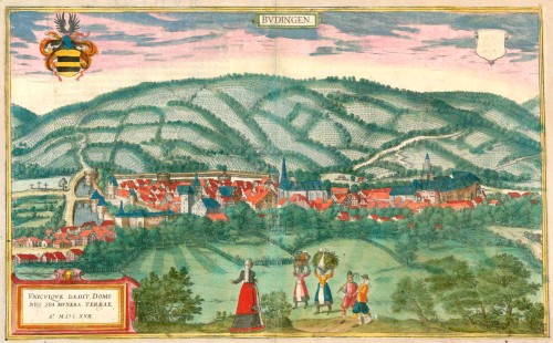 COMMENTARY BY BRAUN: "This is a fine handsome city; it lies on the Kinzig, which flows into the Main. It is part of the area belonging to the Counts of Ysenburg, who call themselves the lords of Büdingen and who have a great castle and court there. The surrounding mountains are full of fruitful vines; there are also impressive vegetable gardens and orchards and fine pastures, so that nothing is lacking here that is needed for human nourishment, except that much sweat and labour are required to produce it from the soil."