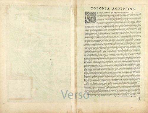 COMMENTARY BY BRAUN (on verso): "Cologne is a large and famous city in Germany this side of the Rhine. It is known firstly for its church of unsurpassable size, the cathedral. It is built with wonderful art high into the sky out of stone hewn in a spirited manner and is dedicated to St Peter the Apostle. [...] The town hall of this city is particularly finely decorated; it has a tall and skilfully executed tower of ashlars and stones dressed with the aid of a level. The top of the town hall has many windows from which you can look out over the whole city. To the east, where the town hall faces the Alter Markt, is a beautiful gallery and a pretty clock."
