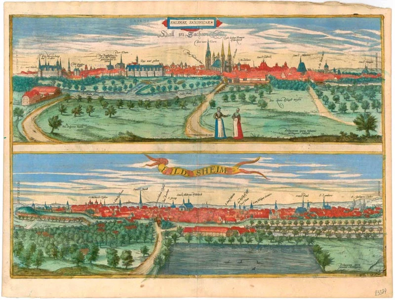 Two bird's-eye views on one sheet: Hall and Hildesheim.