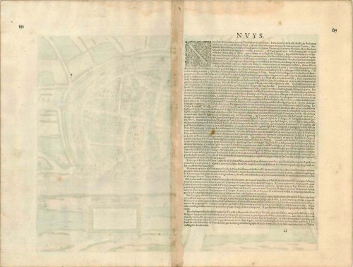 COMMENTARY BY BRAUN (on verso): "The shape of Neuss is long rather than wide, and the Erft runs along the long side before flowing into the Rhine. The city is very well protected by the river and needs no other moats. From the Rhine another sidearm flows up to the city, joining the Erft in front of the city. For this reason, even big ships with their cargoes can sail directly to the city from the Rhine."
