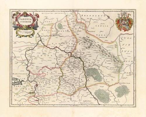 Joannes Janssonius (Arnhem, 1588-1664), son of the Arnhem publisher Jan Janssen, married Elisabeth Hondius, daughter of Jodocus Hondius, in Amsterdam in 1612. After his marriage, he settled down in this town as a bookseller and publisher of cartographic material. In 1618, he established himself in Amsterdam next door to Blaeu’s bookshop. He entered into serious competition with Willem Jansz. Blaeu when copying Blaeu’s Licht der Zeevaert after the expiration of the privilege in 1620. His activities concerned the publication of atlases, books, single maps, and an extensive book trade with branches in Frankfurt, Danzig, Stockholm, Copenhagen, Berlin, Koningsbergen, Geneva, and Lyon. In 1631, he began publishing atlases together with Henricus Hondius.
