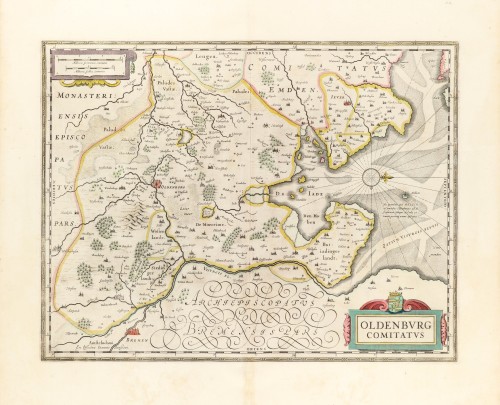 Joannes Janssonius (Arnhem, 1588-1664), son of the Arnhem publisher Jan Janssen, married Elisabeth Hondius, daughter of Jodocus Hondius, in Amsterdam in 1612. After his marriage, he settled down in this town as a bookseller and publisher of cartographic material. In 1618, he established himself in Amsterdam next door to Blaeu’s bookshop. He entered into serious competition with Willem Jansz. Blaeu when copying Blaeu’s Licht der Zeevaert after the expiration of the privilege in 1620. His activities concerned the publication of atlases, books, single maps, and an extensive book trade with branches in Frankfurt, Danzig, Stockholm, Copenhagen, Berlin, Koningsbergen, Geneva, and Lyon. In 1631, he began publishing atlases together with Henricus Hondius.