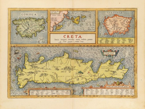 Old, antique map of Corsica, Crete (Creta), Sardinia, by Abraham Ortelius.