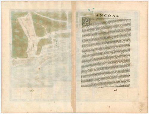 TRANSLATION OF CARTOUCHE TEXT: Ancona, a famous city in Picenum on the Adriatic, is embellished by a most excellent harbour: none is more commodious or spacious than all of Italy. It takes its name from its location, which resembles the crook of an elbow. It is famed for its trade and has an abundance of grain, wine, and all other necessities of life; it is redolent everywhere of great age.