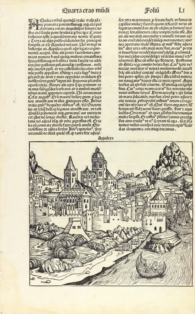 On verso: Fantasy view of Aquileya by Hartmann Schedel.