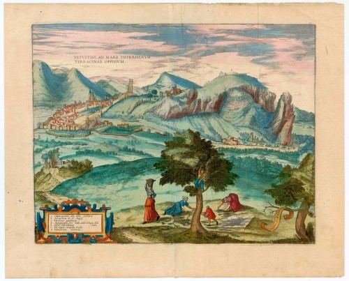 COMMENTARY BY BRAUN: "Terracina is an ancient city in Latium surrounded by the sea in earlier times. It stood originally on a hill surrounded by valleys filled with seawater. But since these valleys have been filled with earth, the hill is now on the mainland, and the city stretches to the coast. The Via Appia that leads from Rome to Brindisi passes by Terracina, but at the present time, it is flooded by marsh water."