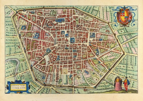 COMMENTARY BY BRAUN (on verso): "As for the other famous buildings, the town hall of Bologna is uncontestedly one of the most splendid buildings in all of Europe when one considers its beauty and size alone, without taking its age into account, especially since it is built of fired brick. In addition, there are many patrician houses here, which are handsome beyond compare and are described by Leander in his history of Bologna, for which there is not enough space here to do justice to them in a few words. The city boasts many tall towers, and the above-mentioned Asinelli tower is one of the highest in Europe. [...] Bologna was also presented with a particular adornment by Theodosius II. After his father had destroyed the city, he rebuilt it in AD 433 and granted important privileges to the university there."