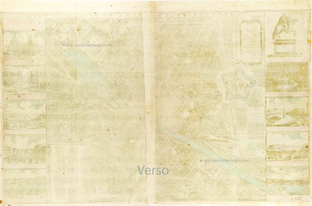 Along the left and right border are nine scenes of the town and public games (each 7 x 10 cm) and the equestrian statue of Cosimo I de' Medici (made 1594) (12.5 x 10 cm).