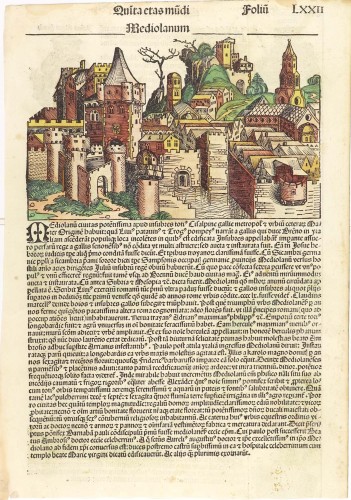 Old, antique fantasy view of Milano, by Hartmann Schedel.