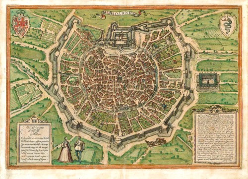 Antique map - bird's-eye view plan of Milan (Milano), by Braun and Hogenberg.