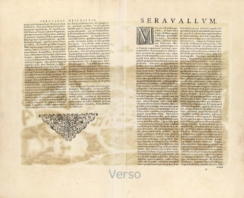 COMMENTARY BY BRAUN (on verso): "Serravalle, a market town renowned for cloth, wine and grain, is in such a beautiful situation that the number of its inhabitants, attracted by the loveliness of the place, has grown so much at times that the wall encircling it has had to be enlarged for the third time. The city and the surrounding town once belonged to the Church in Ceneda as an imperial fief. It subsequently became the seat of the Da Camino family (a princely house that was one of the five most noble in Italy at that time). Now, the city is under the sway of the Venetians but is prudently governed by them, for they send only one city councillor with instructions to ensure that justice prevails and to collect duties. In all else, power lies in the hands of the noble families."