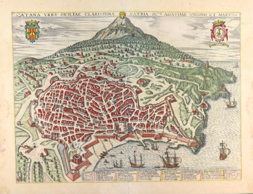 COMMENTARY BY BRAUN (on verso): "Catania is a very old town in Sicily, which was praised by the Greek and Roman authors. It borders on the sea on one side and Etna on the other [...]. On the side from which one sails for Naxos, the town formerly had a magnificent maritime harbour; this was filled in by Etna's enormous eruption, however, so that nothing but a mound of large rocks lies on this spot today. The town was formerly also very well known for its mounted troops. Today the city is famous for the Liberal Arts that are taught there. One also finds that people learned a lot about imperial and papal law here."