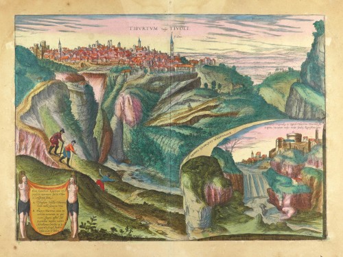 This is a view from the northeast of Tivoli, situated on a plateau above the gorge of the River Aniene. The spire of the cathedral of San Lorenzo rises above the city; on the left is the castle, known as the Roca Pia. From the first century BC, Tivoli was a resort for the Romans during the summer months; some important ancient monuments have been preserved, such as the Villa Adriana outside the city walls, which, together with the Villa d'Este, is a UNESCO World Heritage Site. On the left are Abraham Ortelius and Georg Hoefnagel descending the slope during their visit to Tivoli in 1578. Hoefnagel directs the viewer's attention to the impressive waterfall of the Aniene. (Taschen)