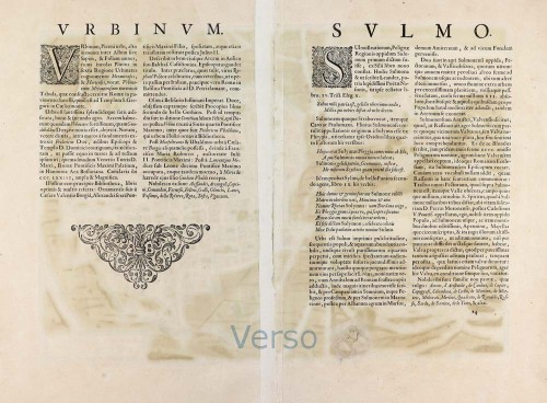 Surrounded by 14th-century fortifications, the city is seen in bird's-eye from the northwest. In the lower centre are the church and palace of Santissima Annunziata, above which is San Francesco della Scarpa with the Portale di San Francesco. Immediately above this is the church of Santa Maria Della Tomba, which was built on the site of the temple to Jupiter. The inscription to the left refers to this temple and, like the cartouche, discloses why this particular city was included in the present work. As the birthplace of the Roman poet Ovid (b. 43 BC), Sulmona was a name all Renaissance humanists revered. (Taschen)