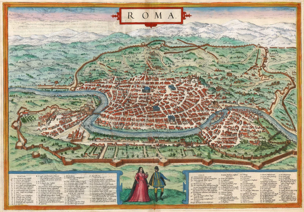 Antique map - bird's-eye view plan of Rome by Braun and Hogenberg, with key to locations.