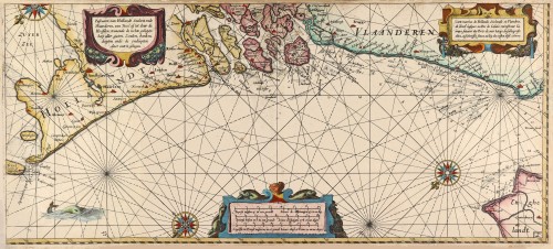 Old, antique sea chart of the coasts of Holland, Zeeland, and Flanders by Willem Blaeu, pirate edition by Joannes Janssonius.