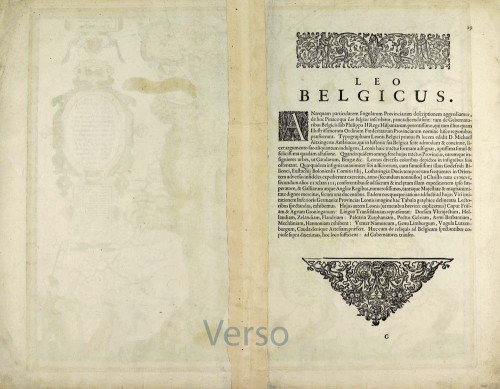 Second state (only two copies were recorded for the first state). In the reverse text of the 1617-a edition, Kaerius acknowledges the adaptation of the lion from Von Aitzing: "typographicam Leonis Belgici primus in lucem edidit D. Michael Aitsingerius Austriacus" ("The Austrian Michael von Aitzing first published this representation of the Leo Belgicus").