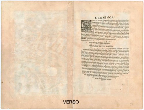 TRANSLATION OF CARTOUCHE TEXT: Groningen, a wealthy and populous Frisian city, strongly fortified against enemy attacks, referred to by Ptolemy as Phileum; built and named by Grunno, brother of the Frankish king Anthenor in AD 377, as written by Hunibald.