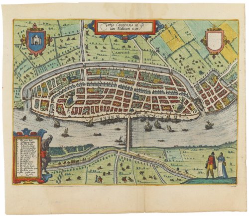 City map in a bird's-eye view of Kampen by Lodovico Guicciardini, after Braun & Hogenberg.