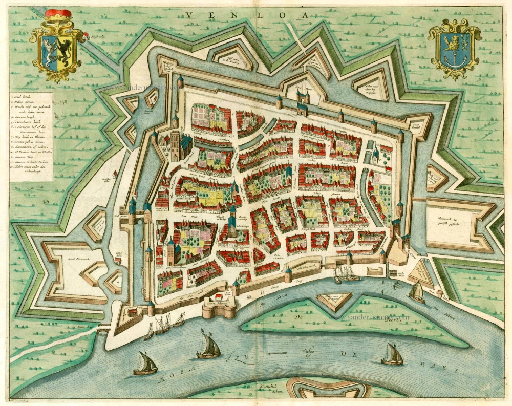Old, antique map - Bird's-eye plan of Venlo by J. Blaeu, with key to locations and two coats-of-arms.