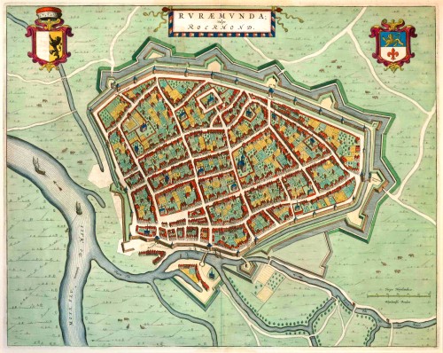 Old, antique bird’s-eye view plan of Roermond, by Joan Blaeu.