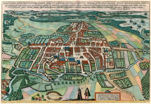COMMENTARY BY BRAUN: "Odense is the capital of Funen, which is the loveliest and most fertile island in the Kingdom of Denmark. It is distinguished by magnificent buildings and splendid churches, of which the noblest is the basilica of the King of Denmark, St Canute. Within the city there is also a St John's monastery, but since all the monks have died, it now houses the royal town hall. The city has a large, wide market in which tribunals are also held and fish is sold."