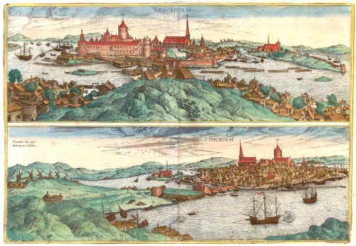 Two bird's-eye views of Stockholm after Hieronymus Scholäus.
