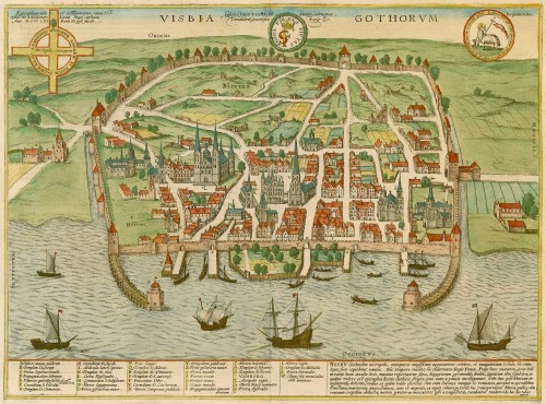 COMMENTARY BY BRAUN: "On the Island of Gotland, where the Baltic Sea borders Sweden, Livonia and Prussia, in a region extremely well suited for cattle farming, for game, fish, marble quarrying and other vital necessities, lies the splendid city of Visby, famed throughout almost the whole of Christendom, whose large and ancient marble buildings still bear witness to its magnificence today. In 1288 it was granted its civic rights by King Magnus Ladulas of Sweden and with these the freedom to fortify the town with walls. [...] Right up to the present day, the inhabitants can still show visitors ten churches and four monasteries built in a single style of architecture. [...] It was in Visby harbour that the famous fish was caught, out of whose belly a child was cut, in the year of our Lord 1289."