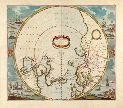 With the many advances in knowledge of the Arctic waters in the first third of the century, the Gerard Mercator map of the North Pole, 1595, had become obsolete. In recognition of the English's prominent role in pursuing the North-West Passage, Hondius introduced a new polar map for the English edition of his atlas, 1636.