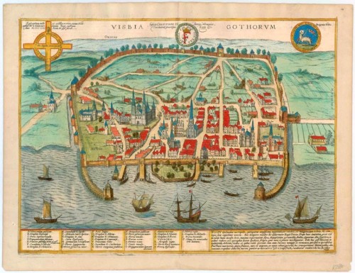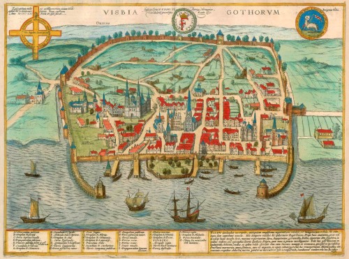 COMMENTARY BY BRAUN: "On the Island of Gotland, where the Baltic Sea borders Sweden, Livonia and Prussia, in a region extremely well suited for cattle farming, for game, fish, marble quarrying and other vital necessities, lies the splendid city of Visby, famed throughout almost the whole of Christendom, whose large and ancient marble buildings still bear witness to its magnificence today. In 1288 it was granted its civic rights by King Magnus Ladulas of Sweden and with these the freedom to fortify the town with walls. [...] Right up to the present day, the inhabitants can still show visitors ten churches and four monasteries built in a single style of architecture. [...] It was in Visby harbour that the famous fish was caught, out of whose belly a child was cut, in the year of our Lord 1289."