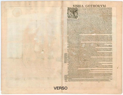 TRANSLATION OF CAPTION: In the name of Christian IV. King of Denmark, Norway, the Vandals and the Goths. COMMENTARY BY BRAUN: "On the Island of Gotland, where the Baltic Sea borders Sweden, Livonia and Prussia, in a region extremely well suited for cattle farming, for game, fish, marble quarrying and other vital necessities, lies the splendid city of Visby, famed throughout almost the whole of Christendom, whose large and ancient marble buildings still bear witness to its magnificence today. In 1288 it was granted its civic rights by King Magnus Ladulas of Sweden and with these the freedom to fortify the town with walls. [...] Right up to the present day, the inhabitants can still show visitors ten churches and four monasteries built in a single style of architecture. [...] It was in Visby harbour that the famous fish was caught, out of whose belly a child was cut, in the year of our Lord 1289." The view from the west shows Visby from the sea. In the town beyond the harbour, three churches stand out in particular: the Santa Maria Kyrka (Q), the convent church of Sankta Katarina (V) in the centre and on the right the Sankt Petri Kyrka (O). Only Sankta Maria (St Mary's) - the cathedral of the Visby diocese since 1572 - still stands today. Visby was continuously occupied from the Viking era onwards. In 1161 Henry the Lion granted the city a trading privilege that guaranteed legal security for commercial transactions. Around the middle of the 12th century Visby served as one of the first centres of the Hanseatic League and was called "Regina Maris", Queen of the Sea. In the 13th century, however, the city lost its leading position in Baltic trade to Lübeck. With the Treaty of Brömsebro in 1645 Visby became part of Sweden. (Taschen)