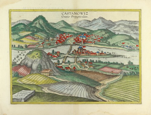 This is a view from the south of the village, featuring its watchtower and church, situated in an idyllic rural wine-growing area. The town lies on the north bank of the Una, on either side of the road that crosses the river. Crescent flags are flying over the fortress on the far right and over the castle on the island built by the Croatian noble family of the Frankopans, showing that we are in an Ottoman-occupied area. The episode referred to by Braun was one of the many conflicts in the border area. Kostajnica (German Castanowitz) was in the hands of the Turks from 1556 to 1687. Today, this small town lies on the border with Bosnia and is called Hrvatska Kostajnica, to distinguish it from Bosanska Kostajnica, located south of Bosnia's river. (Taschen)