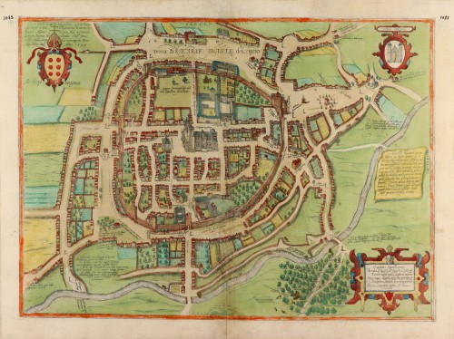 The Civitates Orbis Terrarum, also known as the 'Braun & Hogenberg', is a six-volume town atlas and the most excellent book of town views and plans ever published: 363 engravings, sometimes beautifully coloured. It was one of the best-selling works in the last quarter of the 16th century. Georg Braun, a skilled writer, wrote the text accompanying the plans and views on the verso. Many plates were engraved after the original drawings of a professional artist, Joris Hoefnagel (1542-1600). The first volume was published in Latin in 1572 and the sixth in 1617. Frans Hogenberg, a talented engraver, created the tables for volumes I through IV, and Simon van den Neuwel made those for volumes V and VI. Other contributors were cartographers Daniel Freese and Heinrich Rantzau, who provided valuable geographical information. Works by Jacob van Deventer, Sebastian Münster, and Johannes Stumpf were also used as references. Translations appeared in German and French, making the atlas accessible to a broader audience.
