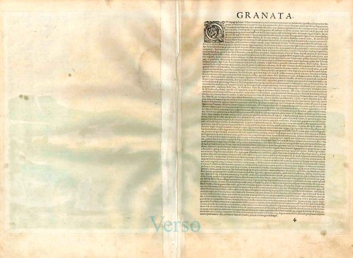 COMMENTARY BY BRAUN: "It is to be suspected that this town was initially an insignificant place that was developed by the Moors on account of its location and fecundity; I suspect this because none of the ancient chroniclers makes any mention of this today important town. I believe that the town takes its name from the shape of a pomegranate. For just as a great many seeds lie close together inside a pomegranate, so when looking at the city of Granada one can see many houses crowded together."