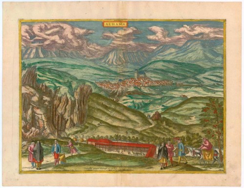 COMMENTARY BY BRAUN: "Alhama is not the least of Spain's cities and is seven miles away from the splendid city of Granada. [...] The city and its surroundings have been richly endowed by nature: considering its fertile soil, high mountains, valleys and rivers, this place lacks nothing. And yet all these gifts are far surpassed by the warm baths that spring up there [...]. These baths are considered, not unjustly, one of the most amazing wonders in the whole of Spain."