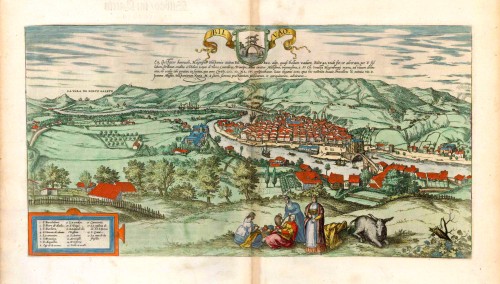 The Civitates Orbis Terrarum, also known as the 'Braun & Hogenberg', is a six-volume town atlas and the most excellent book of town views and plans ever published: 363 engravings, sometimes beautifully coloured. It was one of the best-selling works in the last quarter of the 16th century. Georg Braun, a skilled writer, wrote the text accompanying the plans and views on the verso. Many plates were engraved after the original drawings of a professional artist, Joris Hoefnagel (1542-1600). The first volume was published in Latin in 1572 and the sixth in 1617. Frans Hogenberg, a talented engraver, created the tables for volumes I through IV, and Simon van den Neuwel made those for volumes V and VI. Other contributors were cartographers Daniel Freese and Heinrich Rantzau, who provided valuable geographical information. Works by Jacob van Deventer, Sebastian Münster, and Johannes Stumpf were also used as references. Translations appeared in German and French, making the atlas accessible to a broader audience.