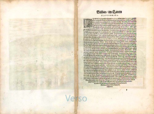 TRANSLATION OF CAPTION: See, benevolent spectator, the magnificent Spanish city of Bilbao, called by others as it were Bellum Vadum ("beautiful ford") Bilvao; this is why they write the second syllable with v. Founded by Didacus Lopez de Hazo, prince of the Cantabrans, around 1300. Drawn charmingly and true to nature by Hogenberg's hand, it is put before your eyes as it looked in 1544.