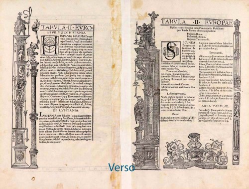On the reverse, the text is contained within elaborate Renaissance woodcut panels, which may have been designed by Albrecht Dürer, the known contributor to diagrams elsewhere in the atlas.