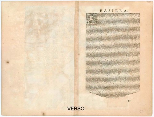 COMMENTARY BY BRAUN (on verso): "The city of Basle consists of two parts, one side, which is on the French side, is called Greater Basle and is very old and a bishopric; it existed already at the time when the Romans were there. The smaller city on the German side has been linked to the greater part by a splendid bridge over the flowing Rhine. [...] No one who has seen this city can deny that it is justly called a royal city, "Baslea", due to its fine, straight streets and its neatly arranged and well-positioned buildings, all of which are magnificent and beautifully embellished, lovely, charming gardens, this is where the monastery of St Peter and the Preachers' Monastery is found."