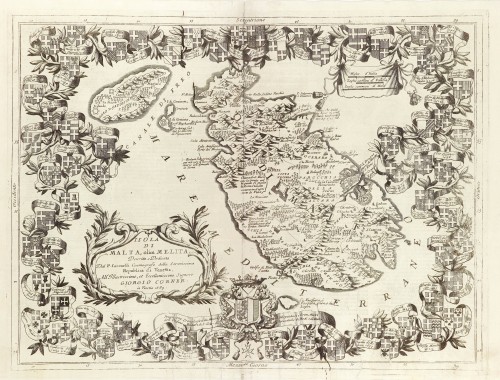 The map is surrounded by 63 armorials of the Grand Masters of the Knights of Malta.
