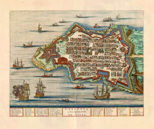 Old, antique bird’s-eye view plan of Valletta (Malta), by Pieter Mortier.