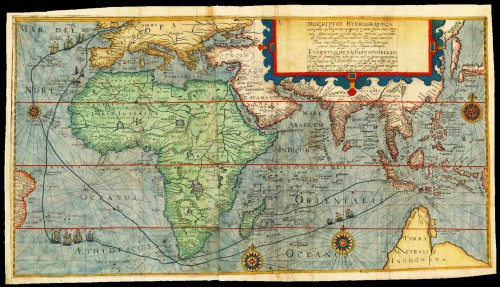 Chart of the Route of the first Dutch fleet to Java, by Th. de Bry. 1599