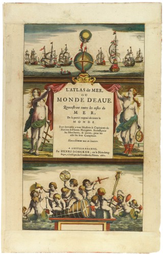 The title page to Doncker's Zee-Atlas consists of three panels. In the centre, two buxom, scantily dressed maidens support the drapery, which reveals the title. One holds a cross-staff; the other, a portable mariner's astrolabe. At the top is a globe above which Atlas, in a half-kneeling position, holds up the heavens. In the background, a panoramic flotilla of ships can be seen in full sail.