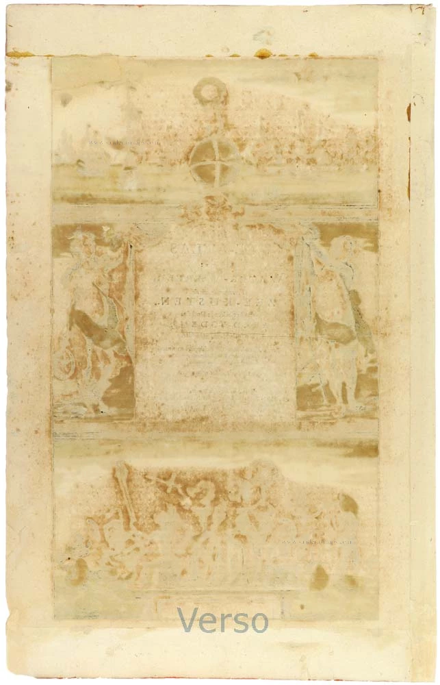 The bottom panel has a group of putti frolicking around an anchored buoy and playing with various navigational instruments. Also in the scene to the right is a suckling mermaid and, to the left, a bearded merman who is having his drinking horn emptied over his head by a particularly sad or drunken putto. Doncker's design must have enjoyed himself constructing such a light-hearted scene, unaware that the English map-maker and publisher Philip Lea was to copy Doncker's design in reverse in about 1689 and reprint it over the next forty years.