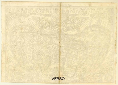 Laurent Fries, whose initials appear in the lower right-hand corner, was probably the co-daughtsman or woodcutter: the twelve windheads and the decorative surround to the map are robust examples of woodcut work. The other initials are those of Johann Kamers (Camertius) in whose book the map apppeared and (in monogram form) L A or Luca Alatses who paid for the production of the map. Peter Apian, a professor of Mathematics in Vienna and Ingolstadt was also a geographic writer and publisher as well as cartographer. His text book Cosmographicus Liber first came out in 1524 and was re-issued for over eighty years. From 1544 onwards it often contains the world map of his pupil Gemma Frisius. Two years earlier, in 1522, Apian published a small treatise Isagore in typum Cosmographicum describing his new map of the world, inferred by Harisse to be an ellipsoidal world map (now lost) rather than the truncated cordiform one of 1520. In 1530 he produced another world map on a cordiform projection." (Shirley)
