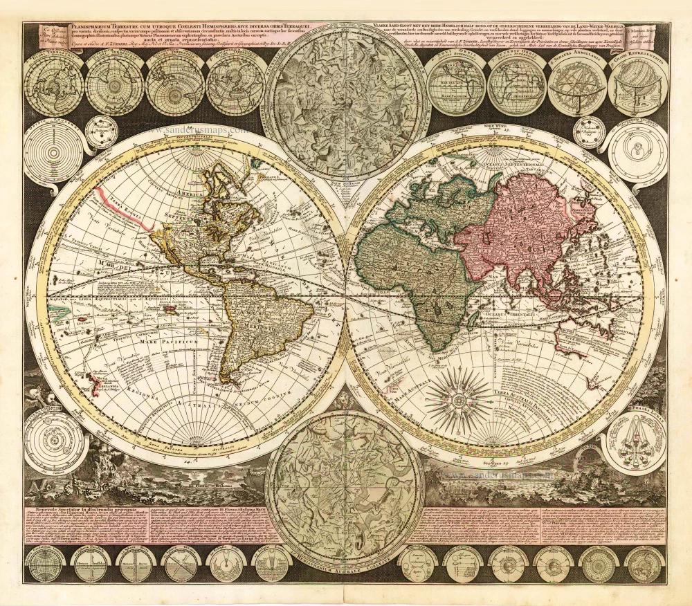 The cartographer Adam Zürner is noted by Bagrow as having an output of over 900 maps, but despite this, he is relatively unknown. This exciting and detailed world map is among several maps produced for Peter Schenk. The two main hemispheres are cartographically up-to-date and show explorers' routes, including Magellan, Dampier, Tasman, Gaetani and Chaumont. Nova Britannia, an island adjacent to New Guinea, is shown with an inscription saying that Dampier discovered it in 1700. Encircling the hemispheres are markings of the winds and climates, and set around the border are no less than twenty-six smaller astronomical diagrams and hemispheres of the world according to different projections. In addition, there are two larger celestial hemispheres and, at the bottom, a panorama illustrating storms, earthquakes, tides, vortices, etc. Below, there is a textual commentary on the natural phenomena depicted. Similar engravings of the earth's physical forces appear in the later general map by J.B. Homann. (Shirley)