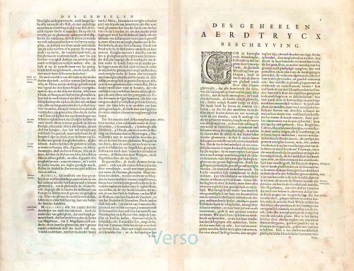 The geographic content is identical to that of the 1606/07 wall map. Because of the smaller size of the folio map, fewer toponyms are given and the number of legends has also been reduced. The centre of North America is taken up by a large oval cartouche containing a Latin text, here in translation: 'America. First discovered in A.D. 1492 by Christopher Colombus in the name of the king of Castille and given the name by Amerigo Vespucci in 1499'. The following legend, here in translation, is inserted in the area to the east of Novaya Zemlya: 'Novaya Zemlya. Discovered in 1596 by Willem Barentszoon from Amsterdam in the name of the States General of the Netherlands'.
